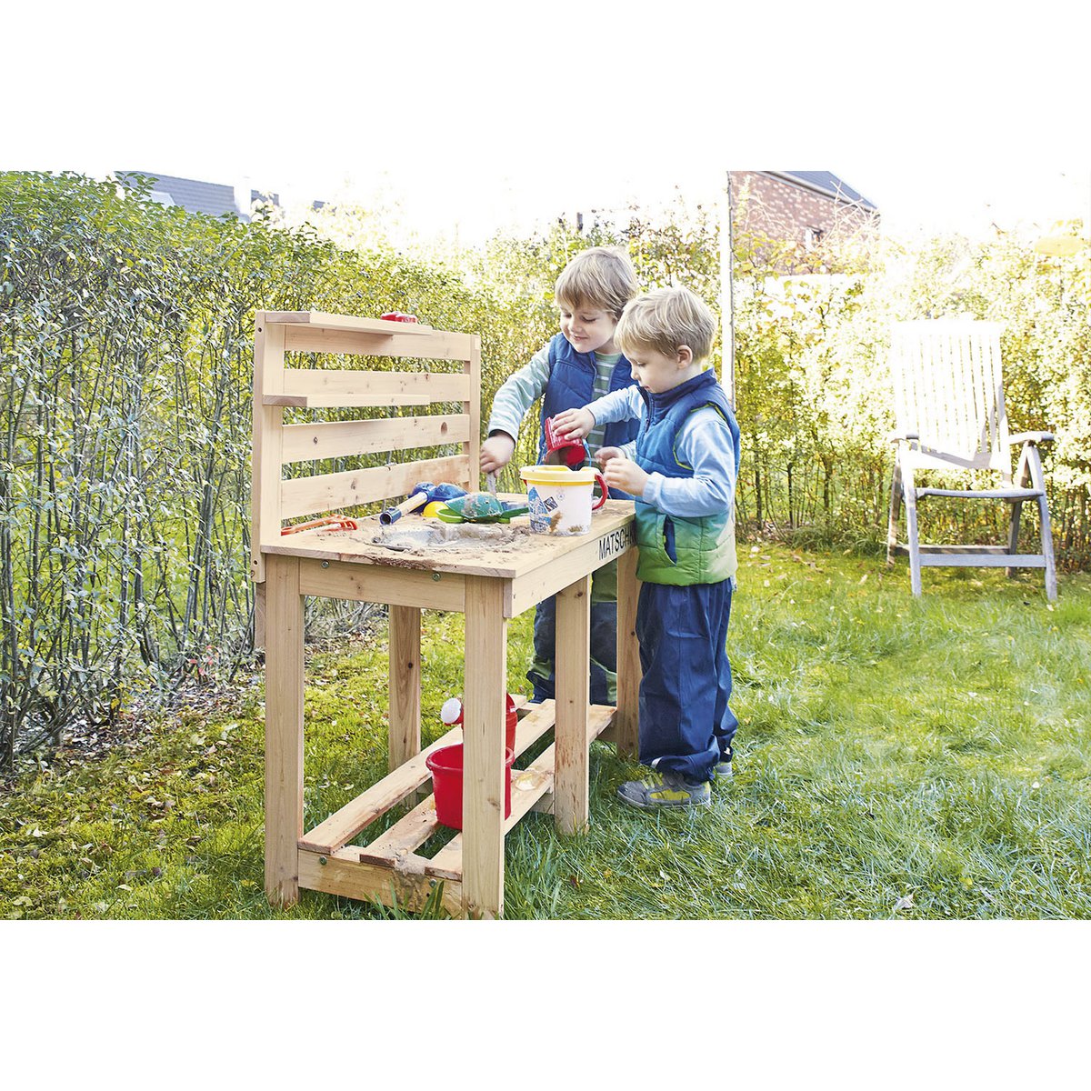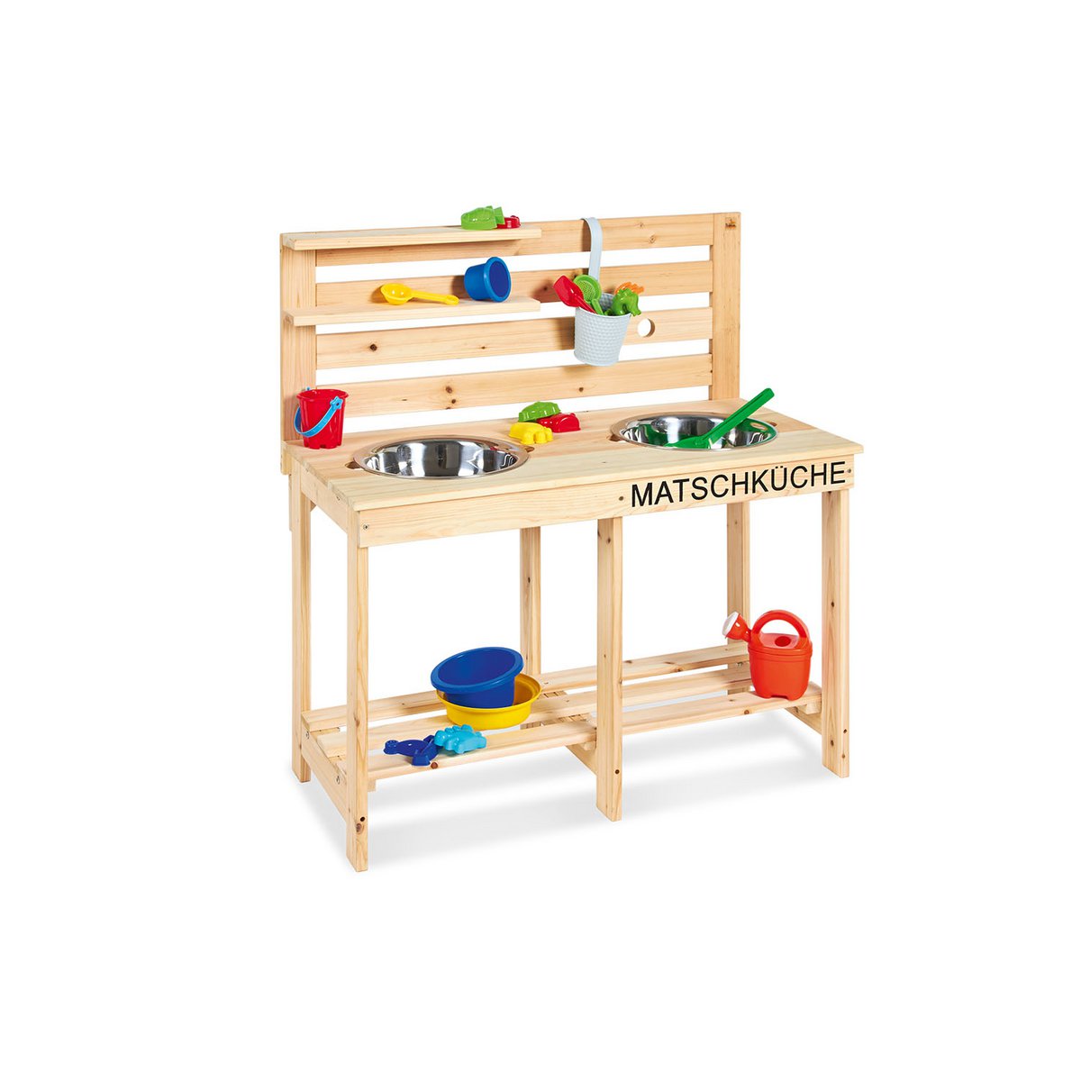 Met twee ruime RVS waskommen (inhoud 3 liter per stuk) en een slimme doorgang voor een tuinslang in de achterwand, wordt elk buitenavontuur een echt ‘keukenfeest’. Het werkblad is op een kindvriendelijke hoogte geplaatst, zodat kinderen comfortabel kunnen kliederen, mengen en gieten. Op de achterwand prijkt het woord ‘Matschküche’, voor een speelse touch.