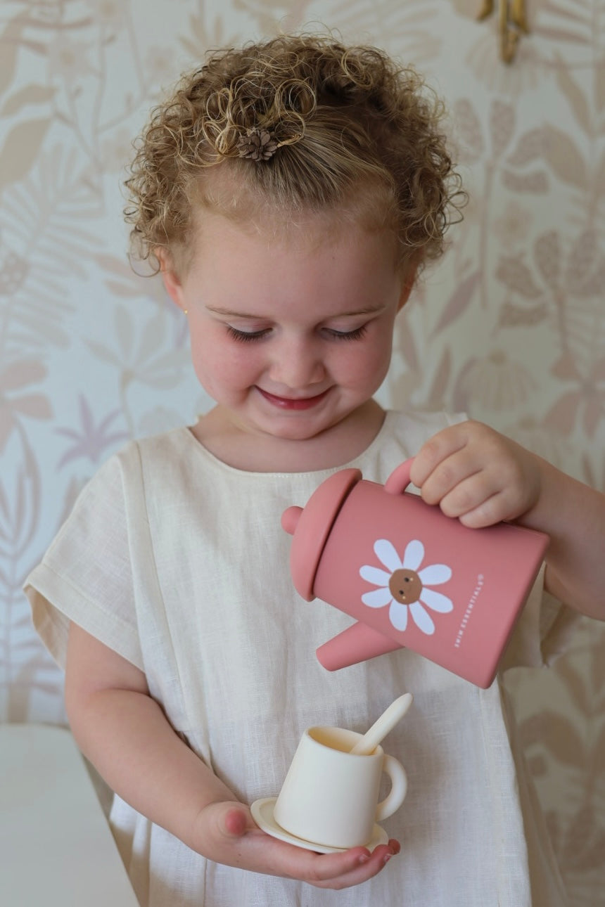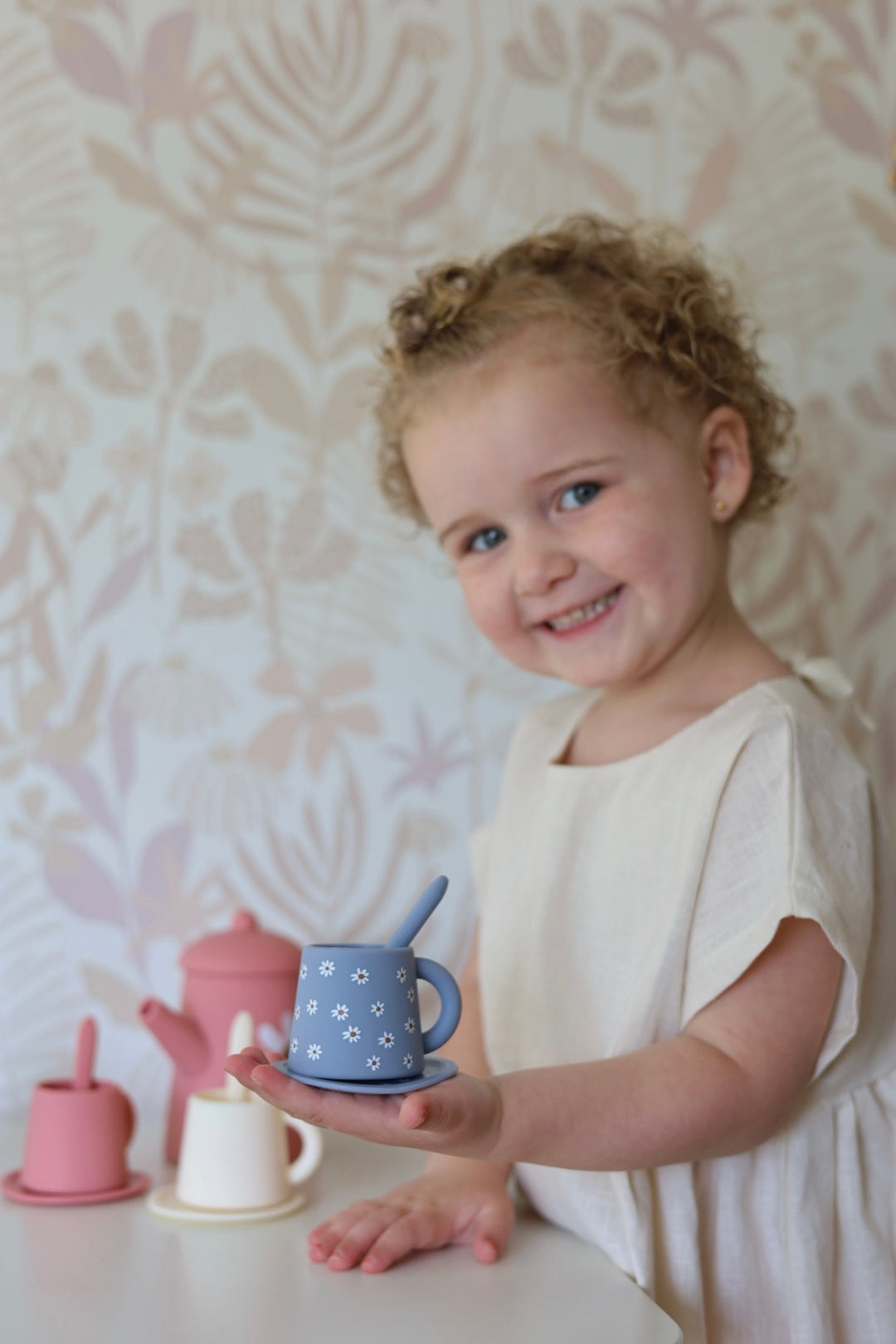 Met deze kleurrijke siliconen thee speelset wordt elk theekransje een vrolijk moment vol fantasie. De set bestaat uit een grote en kleine theepot, vier lepeltjes, vier mokken en bijpassende schoteltjes – alles gemaakt van flexibel en stevig siliconenmateriaal. Ideaal voor kleine handjes én bestand tegen een stootje!