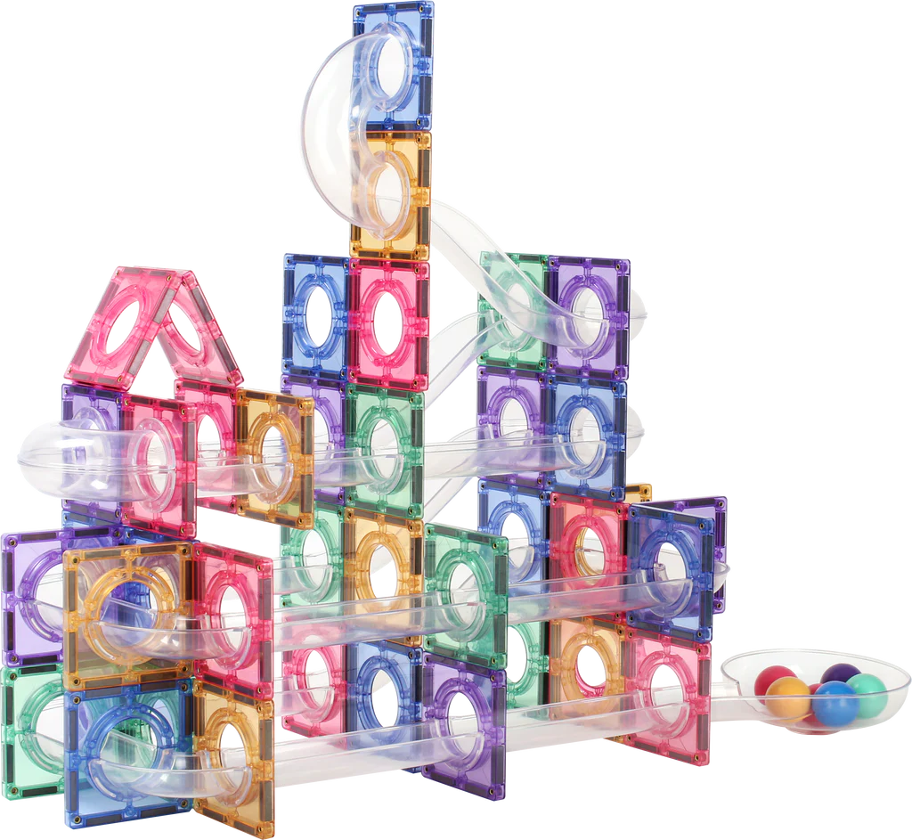 Bouw je eigen knikkerbaan – en daarna weer een nieuwe! Met de Coblo magnetische knikkerbaan (100-delig) kunnen kinderen eindeloos variëren en experimenteren met vormen, kleuren en routes.