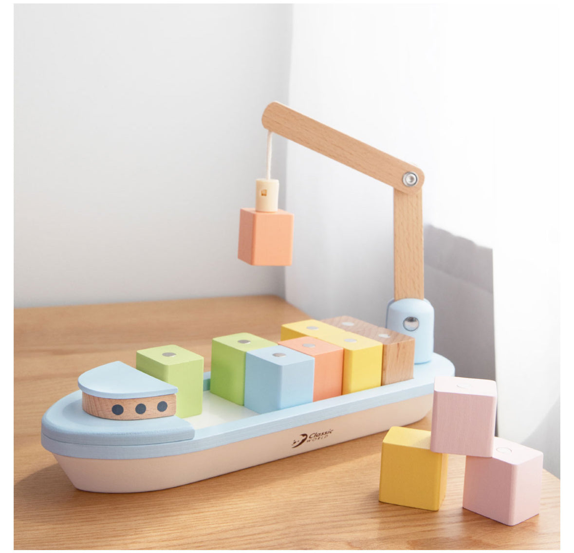 Til, stapel en ontdek! Deze prachtige houten blokkenboot van Classic World is voorzien van een magnetische kraan waarmee kinderen de blokken eenvoudig kunnen oppakken en verplaatsen. Zo wordt spelen niet alleen leuk, maar ook leerzaam.