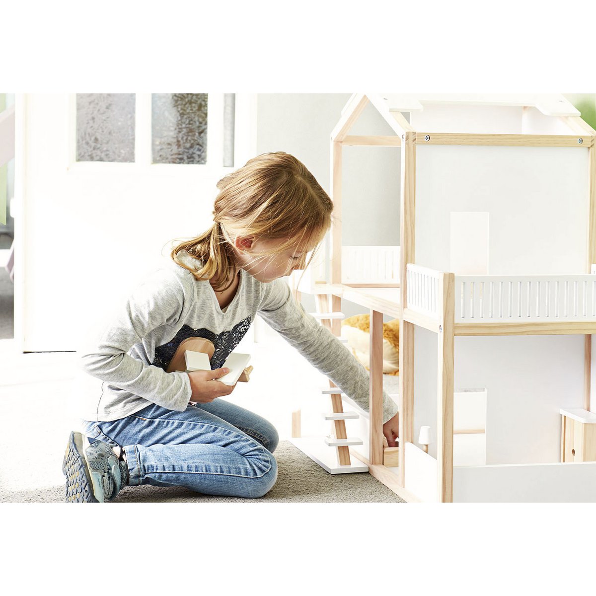 De set is gemaakt van volledig massief grenenhout, deels wit gelakt, en bevat zachte stoffen elementen van 100% polyester. Met deze meubels kunnen kinderen eindeloos verhalen verzinnen en hun poppen een compleet huis geven!