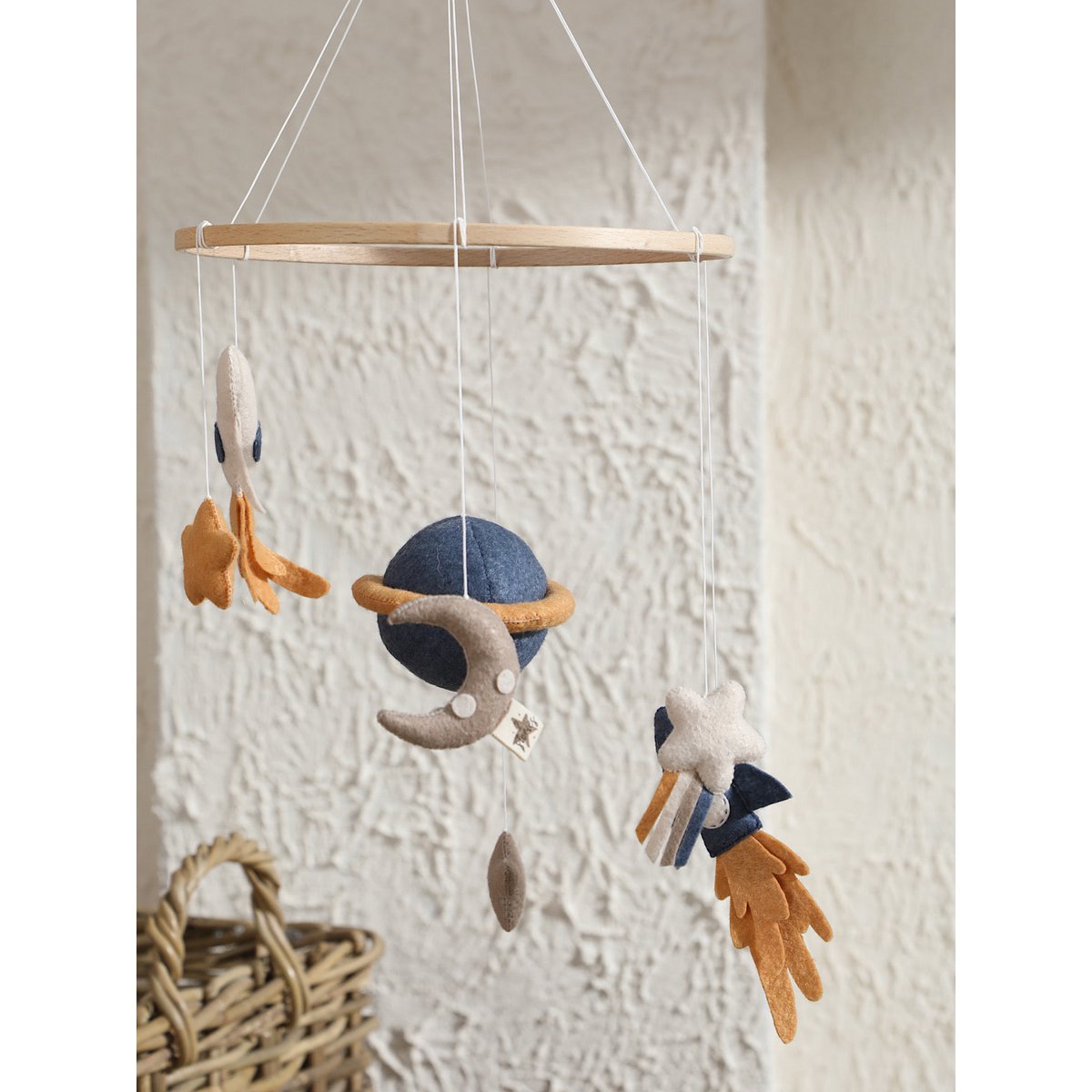 De Space Mobile is een droom voor kleine ruimtereizigers. Deze kleurrijke mobiel is een prachtige aanvulling op elke baby- of kinderkamer en bestaat uit acht hemellichamen en ruimte-elementen: een planeet Saturnus, een maan, twee raketten, twee sterren en twee kometen.